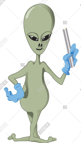 At that moment, a green alien with a giant forehead beamed into the room from above, landing before Damocles.