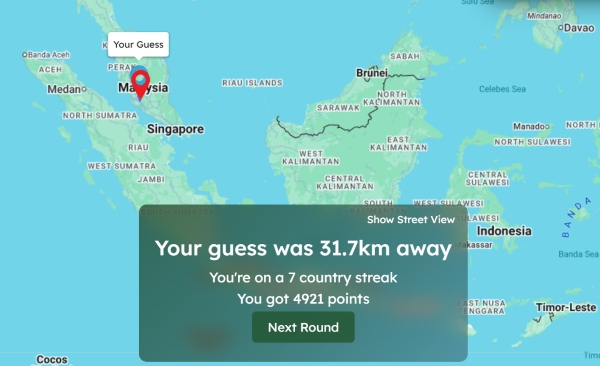 "Without the flag that's a hard one. Not many countries use Chinese writing, the main ones being China, Taiwan and Malaysia (on Worldguessr at least). China is very rare on here, and Taiwan is typically more urban. Malaysia also writes in Arabic, and a language that uses the latin script. Not sure how to narrow it down further than that so going for the capital is the best bet"