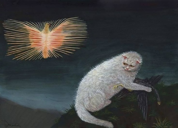 "This painting was done by Aleksandra Waliszewska. I don't know when it was made, or what the title is. There's not a lot of information about her out there, not much information about her artworks either. She lives in Poland, and was born in 1976. Her artworks are often very strange, but she paints cats quite a lot. She has many of her artworks on her instagram. I don't know what this painting is about at all, but if I had to guess then I would say that the light bird is the soul of the dead bird, since they look similar"