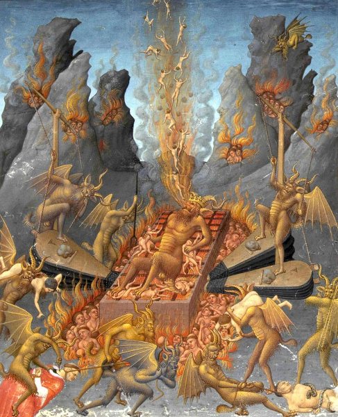 "This is a page from The Very Rich Hours of the Duke of Berry, made between 1412 and 1416 by the Limbourg Brothers. Another depiction of hell, but with a blue skies this time! The manuscript has a lot of nice imagery in it, but this tickled my fancy the most"
